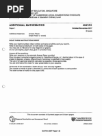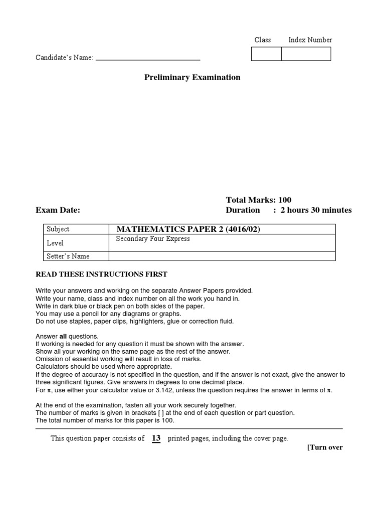 Write your answers and working on the separate Answer Papers provided. Write your name, class and index number on all the work you hand in. Write in dark blue or black pen on both sides of the paper. You may use a pencil for any diagrams or graphs. Do not use staples, paper clips, highlighters, glue or correction fluid. Answer all questions. If working is needed for any question it must be shown with the answer. Show all your working on the same page as the rest of the answer. Omission of essential working will result in loss of marks. Calculators should be used where appropriate. If the degree of accuracy is not specified in the question, and if the answer is not exact, give the answer to three significant figures. Give answers in degrees to one decimal place. For , use either your calculator value or 3.142, unless the question requires the answer in terms of . At the end of the examination, fasten all your work securely together. The number of marks is given in brackets [ ] at the end of each question or part question. The total number of marks for this paper is 100.