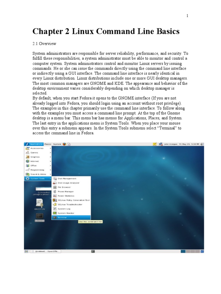 2 The Linux command line interface provides users with an easy, quick, efficient way to manage and use the Linux machines. In fact, many Linux servers dont even have a GUI installed, or GUI interfaces are not available for remote access and remote administration. In addition, the Linux GUI interface does not cover all system functions, and it may take many steps to implement a command line action. Linux administrators need to have a good understanding of Linux commands and know when and how to use them in the command line interface. Most Linux server administrators prefer the command line rather than GUI interface for most activities. This includes day to day operations and job automations such as script for backup and recovery, system initializations, configuration, and performance monitoring. Linux provides a rich set of commands for system administrators to use. This chapter will only discuss the day to day basic operation commands. Commands specific to networking, process, system automation, and security will be discussed in other chapters. When you launch a terminal window as described above, most of the window will be blank except for the prompt where you type in a command to be executed. In the example below the terminal window initially displays [john@localhost ~]$. The beginning is an indication of the username. In this case, john. After the @ is an indication of the machine currently connected to. In this case, localhost means the machine you are currently sitting at. If you had connected to a remote host, its name would be displayed after the @ sign. Following this is an indication of the current working directory. The tilde is a symbol indicating the users home directory. The $ sign indicates that we are logged in as an unprivileged user. A root user would have # sign for its prompt instead of a $. To test the command line interface, type in a simple command: whoami followed by a return or enter. The computer should respond by displaying the username of whoever is logged in. Note that in Linux all commands are case sensitive; so if you enter Whoami or WHOAMI, you will receive a command not found notice.