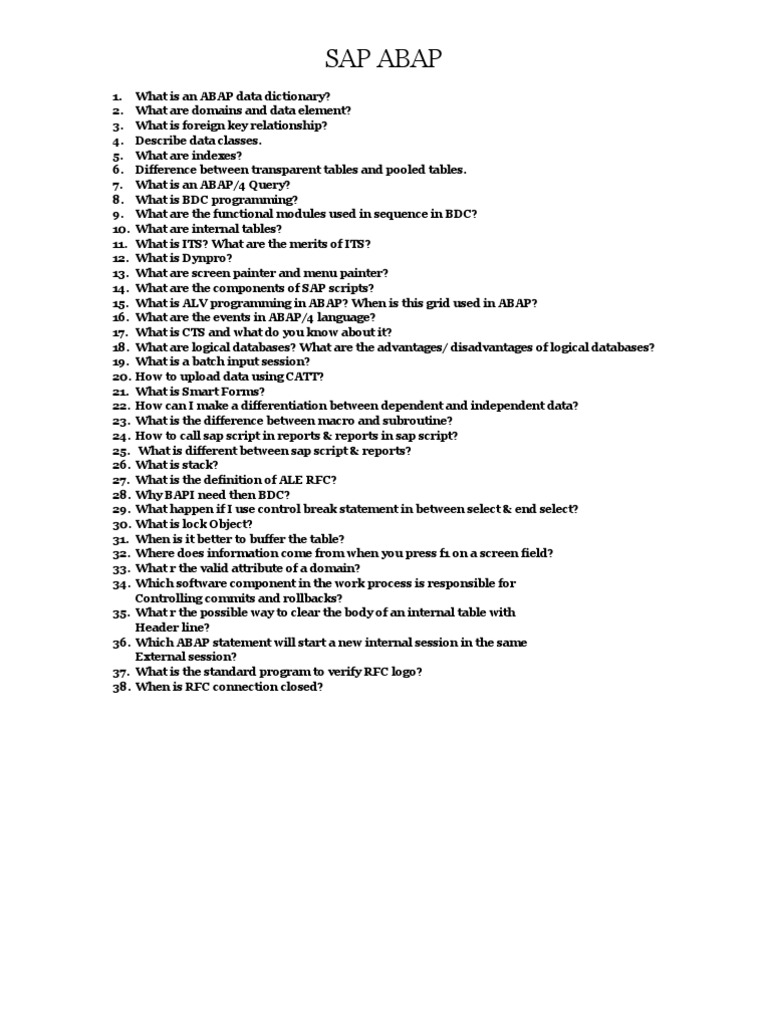 1. 2. 3. 4. 5. 6. 7. 8. 9. 10. 11. 12. 13. 14. 15. 16. 17. 18. 19. 20. 21. 22. 23. 24. 25. 26. 27. 28. 29. 30. 31. 32. 33. 34. 35. 36. 37. 38. What is an ABAP data dictionary? What are domains and data element? What is foreign key relationship? Describe data classes. What are indexes? Difference between transparent tables and pooled tables. What is an ABAP/4 Query? What is BDC programming? What are the functional modules used in sequence in BDC? What are internal tables? What is ITS? What are the merits of ITS? What is Dynpro? What are screen painter and menu painter? What are the components of SAP scripts? What is ALV programming in ABAP? When is this grid used in ABAP? What are the events in ABAP/4 language? What is CTS and what do you know about it? What are logical databases? What are the advantages/ disadvantages of logical databases? What is a batch input session? How to upload data using CATT? What is Smart Forms? How can I make a differentiation between dependent and independent data? What is the difference between macro and subroutine? How to call sap script in reports & reports in sap script? What is different between sap script & reports? What is stack? What is the definition of ALE RFC? Why BAPI need then BDC? What happen if I use control break statement in between select & end select? What is lock Object? When is it better to buffer the table? Where does information come from when you press f1 on a screen field? What r the valid attribute of a domain? Which software component in the work process is responsible for Controlling commits and rollbacks? What r the possible way to clear the body of an internal table with Header line? Which ABAP statement will start a new internal session in the same External session? What is the standard program to verify RFC logo? When is RFC connection closed?