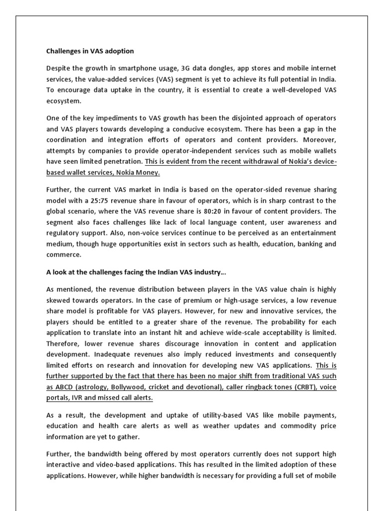 services, the value-added services (VAS) segment is yet to achieve its full potential in India. To encourage data uptake in the country, it is essential to create a well-developed VAS ecosystem. One of the key impediments to VAS growth has been the disjointed approach of operators and VAS players towards developing a conducive ecosystem. There has been a gap in the coordination and integration efforts of operators and content providers. Moreover, attempts by companies to provide operator-independent services such as mobile wallets have seen limited penetration. This is evident from the recent withdrawal of Nokias devicebased wallet services, Nokia Money. Further, the current VAS market in India is based on the operator-sided revenue sharing model with a 25:75 revenue share in favour of operators, which is in sharp contrast to the global scenario, where the VAS revenue share is 80:20 in favour of content providers. The segment also faces challenges like lack of local language content, user awareness and regulatory support. Also, non-voice services continue to be perceived as an entertainment medium, though huge opportunities exist in sectors such as health, education, banking and commerce. A look at the challenges facing the Indian VAS industry As mentioned, the revenue distribution between players in the VAS value chain is highly skewed towards operators. In the case of premium or high-usage services, a low revenue share model is profitable for VAS players. However, for new and innovative services, the players should be entitled to a greater share of the revenue. The probability for each application to translate into an instant hit and achieve wide-scale acceptability is limited. Therefore, lower revenue shares discourage innovation in content and application development. Inadequate revenues also imply reduced investments and consequently limited efforts on research and innovation for developing new VAS applications. This is further supported by the fact that there has been no major shift from traditional VAS such as ABCD (astrology, Bollywood, cricket and devotional), caller ringback tones (CRBT), voice portals, IVR and missed call alerts. As a result, the development and uptake of utility-based VAS like mobile payments, education and health care alerts as well as weather updates and commodity price information are yet to gather. Further, the bandwidth being offered by most operators currently does not support high interactive and video-based applications. This has resulted in the limited adoption of these applications. However, while higher bandwidth is necessary for providing a full set of mobile