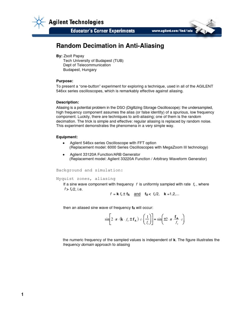 By: Zsolt Papay Tech University of Budapest (TUB) Dept of Telecommunication Budapest, Hungary Purpose: To present a one-button experiment for exploring a technique, used in all of the AGILENT 546xx series oscilloscopes, which is remarkably effective against aliasing. Description: Aliasing is a potential problem in the DSO (Digitizing Storage Oscilloscope): the undersampled, high frequency component assumes the alias (or false identity) of a spurious, low frequency component. Luckily, there are techniques to anti-aliasing; one of them is the random decimation. The trick is simple and effective: regular aliasing is replaced by random noise. This experiment demonstrates the phenomena in a very simple way. Equipment: Agilent 546xx-series Oscilloscope with FFT option (Replacement model: 6000 Series Oscilloscopes with MegaZoom III technology) Agilent 33120A Function/ARB Generator (Replacement model: Agilent 33220A Function / Arbitrary Waveform Generator)