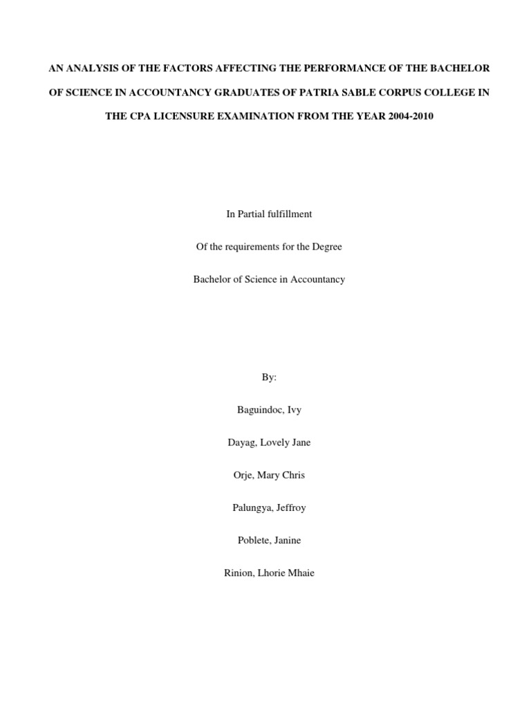 The input would be the profile of the examinees from the year 2004 to 2010. The processes to be used in collecting data are through conducting surveys, interviews, and questionnaires. After gathering data, this would be tabulated, computed, analyzed, and interpreted. And the expected output would be the improvement of the performance of PSCC-BSA graduates in the CPA licensure examination. Statement of the Problem The main purpose of this study is to determine the factors affecting the performance of Patria Sable Corpus College Bachelor of Science in Accountancy graduates in the Certified Public Accountant licensure examination. This study addresses the following concerns: 1. What is the respondents profile in terms of: a. Age b. Gender c. Status d. Year Graduated 2. What are the factors affecting the performance of PSCC-BSA graduates in the CPA Licensure Examination? 3. To what extent do these factors affect the performance of the PSCC-BSA graduates in the CPA Licensure Examination? 4. What are the problems encountered in taking the CPA Licensure Examination? 5. How will these problems be addressed?