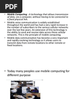 information at any time, any place, and in any form. Whether in the office, at home or virtually any place on earth. mobile computing is the use of computers in a non-static environment. mobile computing is associated with mobility of hardware, data and software in computer applications. The combination of mobile computers and wireless communications is promoting the evolution of information technologies to enable an environment that is often called nomadic/ubiquitous computing.