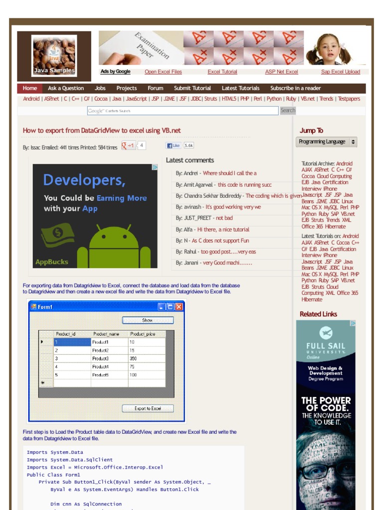 T utorial Archive: Android AJAX ASP C C++ C# .net By: Andrei - Where should I call the a Cocoa Cloud Com puting EJB Java Certification By: Amit Agarwal - this code is running succ Interview iPhone By: Chandra Sekhar Bodireddy - The coding which is givenJavascript JSF JSP Java Beans J2ME JDBC Linux By: avinash - It's good working very we Mac OS X MySQL Perl PHP Python Ruby SAP VB.net By: JUST_PREET - not bad EJB Struts T rends XML Office 365 Hibernate By: Alfa - Hi there, a nice tutorial Latest T utorials on: Android By: N - As C does not support Fun AJAX ASP C Cocoa C++ .net C# EJB Java Certification By: Rahul - too good post....very eas Interview iPhone Javascript JSF JSP Java By: Janani - very Good machi....... Beans J2ME JDBC Linux Mac OS X MySQL Perl PHP Python Ruby SAP VB.net For exporting data from Datagridview to Excel, connect the database and load data from the database EJB Struts Cloud to Datagridview and then create a new excel file and write the data from Datagridview to Excel file. Com puting XML Office 365 Hibernate
