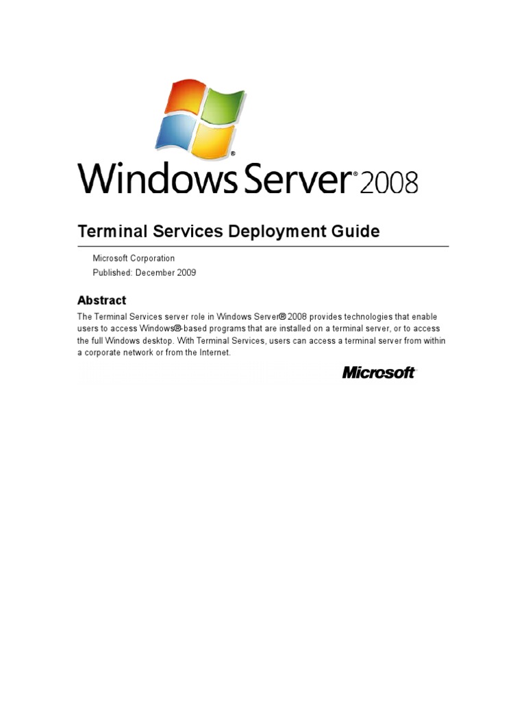 Terminal Services Deployment Guide.............................................................................................1 Abstract....................................................................................................................................1 Contents..........................................................................................................................................3 Terminal Services Deployment Guide.............................................................................................9 About this guide...........................................................................................................................9 In this guide.................................................................................................................................9 Role Services and Features in a Terminal Services Deployment....................................................9 What are the role services and features in a Terminal Services deployment?........................10 Deploying Terminal Server............................................................................................................12 Installation Prerequisites for Terminal Server................................................................................12 Using Remote Desktop.................................................................................................................14 Installing Terminal Server on a Domain Controller........................................................................15 Terminal Services and Windows Firewall......................................................................................16 Checklist: Configuring Terminal Server.........................................................................................17 Configuring Terminal Server..........................................................................................................18 Install the Terminal Server Role Service.......................................................................................18 Install the Terminal Server role service (when Terminal Services is already installed)...............20 Configure License Settings for a Terminal Server.........................................................................21 Specify the Terminal Services Licensing Mode.............................................................................22 Specify the License Server Discovery Mode.................................................................................23 Configure the Network Level Authentication Setting for a Terminal Server...................................24 Install Programs on a Terminal Server..........................................................................................25 Additional considerations....................................................................................................26 Configure the Remote Desktop Users Group................................................................................26 Managing Terminal Server............................................................................................................27 Change Remote Connection Settings...........................................................................................27