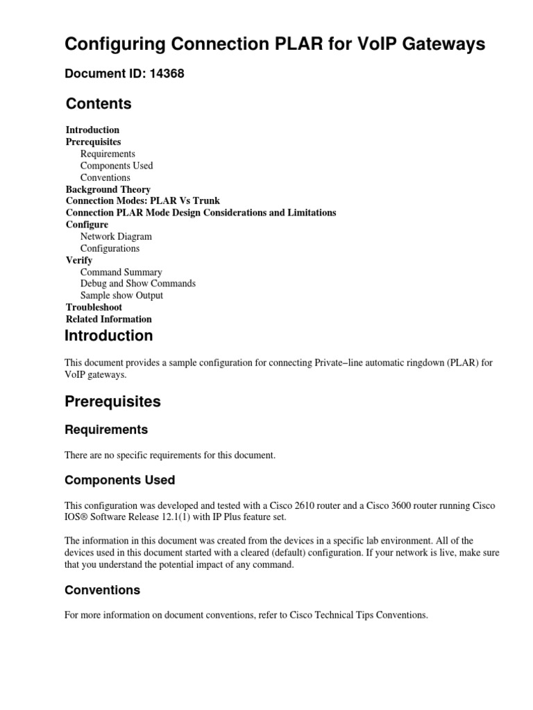 This document provides a sample configuration for connecting Privateline automatic ringdown (PLAR) for VoIP gateways.
