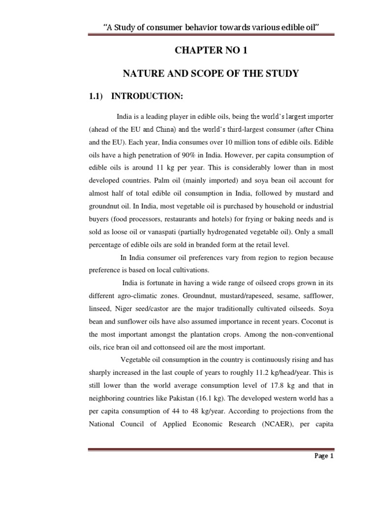 may be approved by a manager, with the final purchase being made by a purchase specialist who spends all his or her time finding the best deal on the goods that the organization needs. Often, such long purchase processes can cause long delays. In the government, rules are often especially stringente.g., vendors of fruit cake have to meet fourteen pages of specifications put out by the General Services Administration. In many cases, government buyers are also heavily bound to go with the lowest price. Even if it is obvious that a higher priced vendor will offer a superior product, it may be difficult to accept that bid. 1.3) DEFINITION OF THE PROBLEM: As we know that todays market is very competitive and full of challenges, to expansion, company should search the market potential of product. The size of a market in terms of revenue, number of buyers, or other factors Estimated maximum total sales revenue of all suppliers of a product in market during certain period. More competitors are attracted to the market as they see the market potential to provide high profits. Competitors selling products customers previously purchased to satisfy needs now addressed by the new product form may be extremely aggressive ( may be entering the maturity stage of their industries PLC) resulting in major price reduction. This may delay the adoption of the new product form by some early majority to know the best consumer buying behavior and demand into the minds of consumers because always consumer says something and does something. There are many companies manufacturing the edible oil into the market, at the same time as there are many companies manufacturing idea about thinking of consumer on whether, what, how and for whom to purchase edible oil. Therefore, research is required to measure present consumer buying behavior at the purchase of edible oil. So the researcher problem is to identify what are the criteria that prospective customer takes into consideration before buying the edible oil.