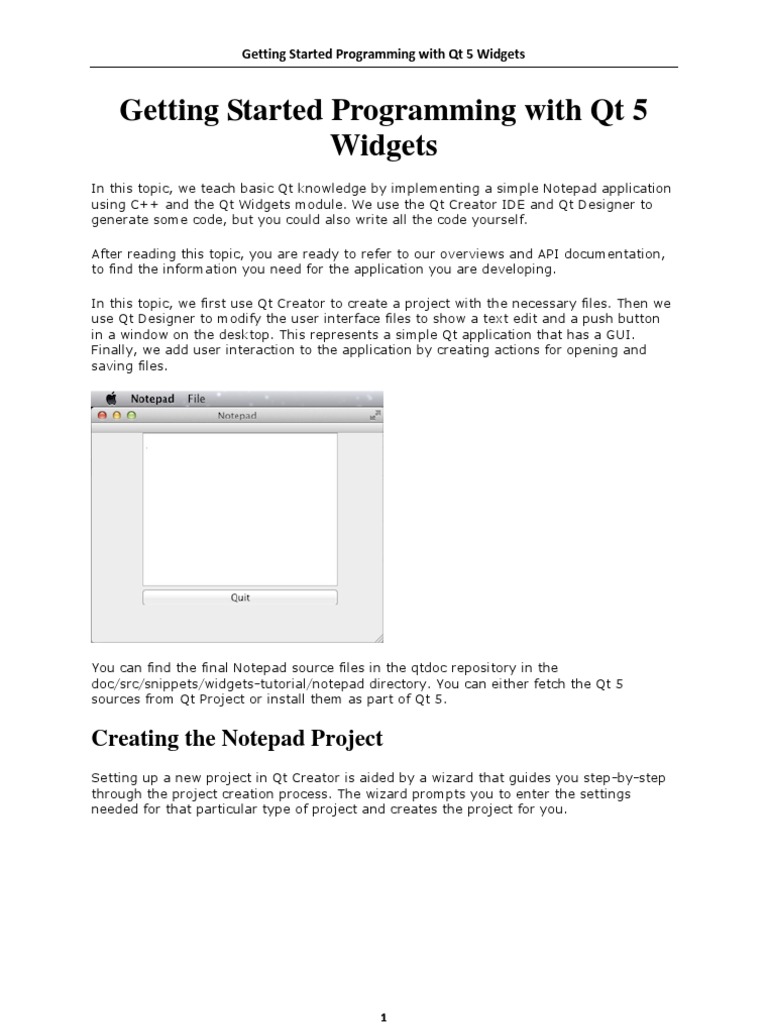 In this topic, we teach basic Qt knowledge by implementing a simple Notepad application using C++ and the Qt Widgets module. We use the Qt Creator IDE and Qt Designer to generate some code, but you could also write all the code yourself. After reading this topic, you are ready to refer to our overviews and API documentation, to find the information you need for the application you are developing. In this topic, we first use Qt Creator to create a project with the necessary files. Then we use Qt Designer to modify the user interface files to show a text edit and a push button in a window on the desktop. This represents a simple Qt application that has a GUI. Finally, we add user interaction to the application by creating actions for opening and saving files.