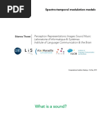 by a listener. The Structured Additive Synthesis (SAS) model has the exibility of additive synthesis while addressing these problems. It imposes constraints on the additive parameters, giving birth to structured parameters as close to perception and musical terminology as possible, thus reintroducing a perceptive and musical consistency back into the model. The remaining of this section quickly presents the SAS model. An extended presentation can be found in DCM99]. SAS consists of a complete abstraction of sounds according to only four physical parameters, functions closely related to perception: Amplitude A : time ! amplitude Human beings perceive amplitude on a logarithmic scale. Amplitude can be calculated from the P P additive parameters like this: A(t) = p=1 ap (t). Calculating the volume in dB from the amplitude is easy: 20 log10 ( A0A ). dB Frequency F : time ! frequency The way of calculating the frequency from the additive parameters is trickier, and can be found in DCM99]. Anyway, for harmonic sounds F coincides with the fundamental, possibly missing or \virtual". The frequency is also perceived on a logarithmic scale. For example, the MIDI pitch F ). is a function of frequency: 57 + 12 log2 ( 440 Color C : frequency time ! amplitude Color coincides with an interpolated version of the spectral envelope Ris86]. We call it color by analogy between audible and visible spectra. This analogy is already well-known for noises (white, blue, etc.). Warping W : frequency time ! frequency Generally, the partial frequencies are not exactly multiples of the fundamental frequency F . Warping gives the real frequency of a partial from the theoretical one it should have had if the sound had been harmonic. Of course for all harmonic sounds W (t) = Id, that is, 8t; W (f; t) = f .
