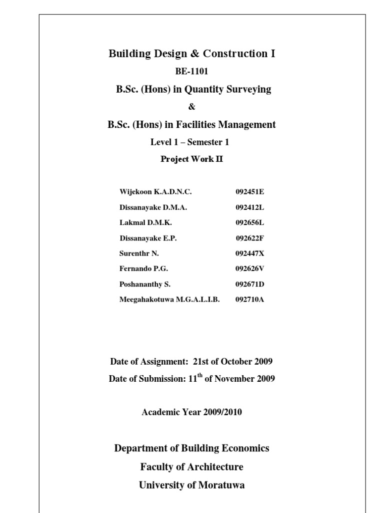 We would like to acknowledge and extend our gratitude to the Building Design and Construction lecturers Archt. Lalith De Silva and Ms. Saranga Weerawardhana enlightening us by giving a wise knowledge about the subject and related areas. Also the Project work lecturer Ms. H. Chandani, who made this project work a success by giving her helping hand in all the time we race our problems. Equally, we thank the librarian and the staff of the computer lab who helped us with finding resources to make this project more meaningful. More gratefully we like to appreciate the support given by our own batch mates, friends and family members. Last but not least our gratitude comes to all our group members, who always stood behind and helped to make a better outcome.