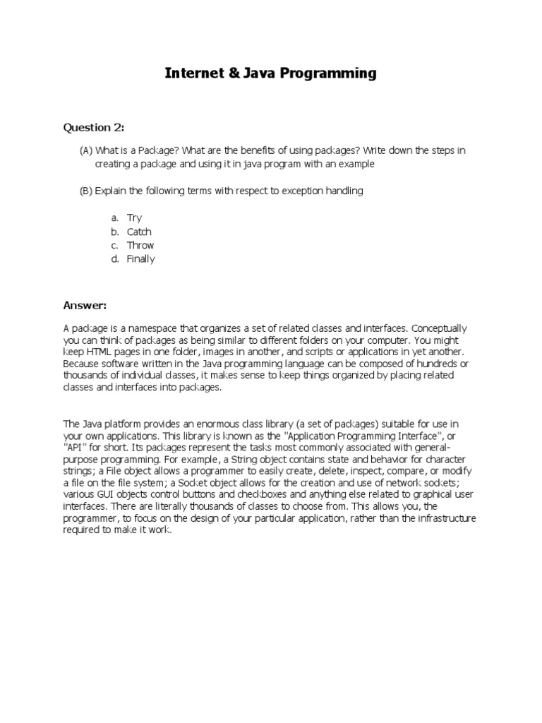(A) What is a Package? What are the benefits of using packages? Write down the steps in creating a package and using it in java program with an example (B) Explain the following terms with respect to exception handling a. b. c. d. Try Catch Throw Finally