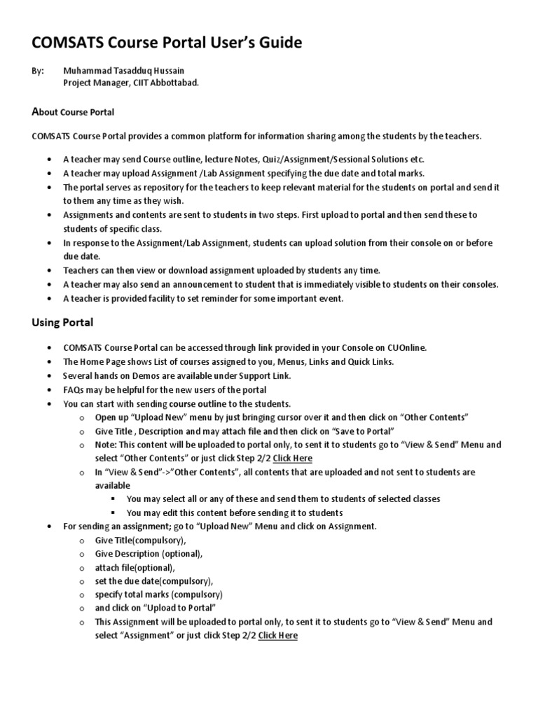 COMSATS Course Portal can be accessed through link provided in your Console on CUOnline. The Home Page shows List of courses assigned to you, Menus, Links and Quick Links. Several hands on Demos are available under Support Link. FAQs may be helpful for the new users of the portal You can start with sending course outline to the students. o Open up Upload New menu by just bringing cursor over it and then click on Other Contents o Give Title , Description and may attach file and then click on Save to Portal o Note: This content will be uploaded to portal only, to sent it to students go to View & Send Menu and select Other Contents or just click Step 2/2 Click Here o In View & Send->Other Contents, all contents that are uploaded and not sent to students are available You may select all or any of these and send them to students of selected classes You may edit this content before sending it to students For sending an assignment; go to Upload New Menu and click on Assignment. o Give Title(compulsory), o Give Description (optional), o attach file(optional), o set the due date(compulsory), o specify total marks (compulsory) o and click on Upload to Portal o This Assignment will be uploaded to portal only, to sent it to students go to View & Send Menu and select Assignment or just click Step 2/2 Click Here