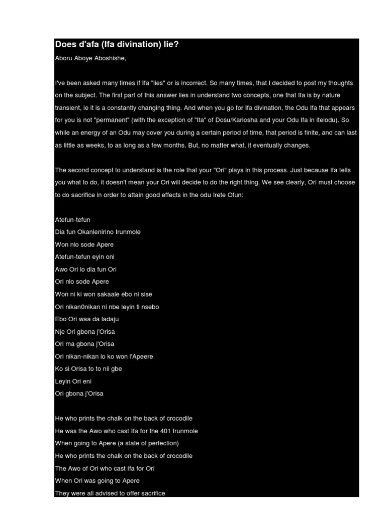 I've been asked many times if Ifa "lies" or is incorrect. So many times, that I decided to post my thoughts on the subject. The first part of this answer lies in understand two concepts, one that Ifa is by nature transient, ie it is a constantly changing thing. And when you go for Ifa divination, the Odu Ifa that appears for you is not "permanent" (with the exception of "Ita" of Dosu/Kariosha and your Odu Ifa in itelodu). So while an energy of an Odu may cover you during a certain period of time, that period is finite, and can last as little as weeks, to as long as a few months. But, no matter what, it eventually changes.