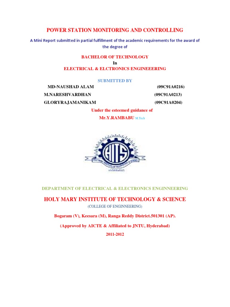 This is to certify that the project report entitled POWER STATION MONITORING AND CONTROLLING that is being submitted by MD-NAUSHAD ALAM (09C91A0216), M.NARESH VARDHAN (09C91A0213),GLORYRAJAMANIKAM (09C91A0204) in partial fulfillment for the award of the Degree of Bachelor of Technology in ELECTRICAL & ELECTRONICS ENGINEERING to the Jawaharlal Nehru Technological University is a record of bonafide work carried out by him under my guidance and supervision. The results embodied in this project report have not been submitted to any other University Institute for the award of any degree or diploma. During the period 2011-12