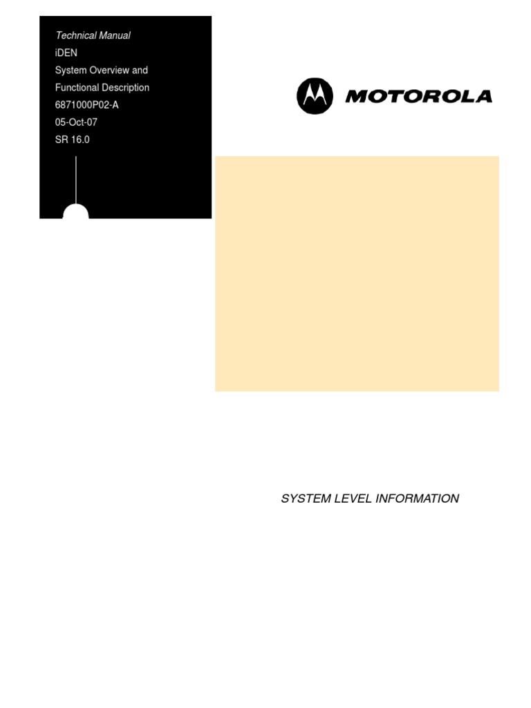 Chapter 1 iDEN Technology Foundation Chapter 2 iDEN System Overview Chapter 3 iDEN Subsystem Overview Chapter 4 New Features in SR16.0 Chapter 5 iDEN System Functional Description Chapter 6 Radio Access Network Details Chapter 7 Interconnect Subsystem Details Chapter 8 Dispatch Subsystem Details Chapter 9 Packet Data Subsystem Details Chapter 10 Network Management Subsystem Details Chapter 11 Other Network Elements