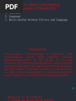 A. Background The need for cross-cultural understanding arises whenever people from different languages and cultures come into contact. With increased tourism, international business, students studying overseas and so on, there is concern to foster better communications among different cultural groups, but before we examines about variation in patterns of communication among cultural groups first of all we need to know about the meaning of culture itself and because culture allows to express itself in various ways such as through the use of language, therefore this paper will discuss the definition, relationship, and the aspects about culture and language which is common in communication system.