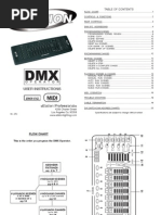 T urn the power on ,it is in MANUAL RUN mode, press PROGRAM for 2 seeonds, corresponding LED blinks, SCENE and CHASE are ready to be brogrammed, press PROGRAM once more to return to RUN mode, corresponding LED goes out. 7. MIDI/ADD A > Press MIDI key when running ,the third and fourth digit of LED flash, select MIDI channel using UP or DOWN, press MIDI key to make programe when in PROGRAM mode. B> Press this key to make programe when in PROGRAM mode. 8. AUTO/DEL A > In RUN mode, press Auto/Del, corresponding LED is ON ,which indicates it is AUTO RUN mode, press once more to withdraw MUSIC mode, corresponding. LED goes out. B , Press this key to make S cene and chase program when in PROGRAM mode. 9. TAPSYNC/DISPLAY A> In AUTO RUN mode, running speed of scene is interval of last TWO pressing of TAP SYNC/DISPLAY ,Max.lO minutes. B , In PROGRAM mode, select display between STEP and BANK ,in other mode: Select display between 00-225 and 0%-100%. 10. BLACKOUT Press this key to disable all channel output, but not any other functions .Press once withdraw Black out mode. 11. MIDI IN Use to receive MIDI data. 12.DMX POLARITY SELECT Select the polarity of DMX output. 13. DMX OUT Use to output DMX 512 signal 14. DCINPUT DC9V-12V ,300 Ma ,MIN.