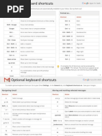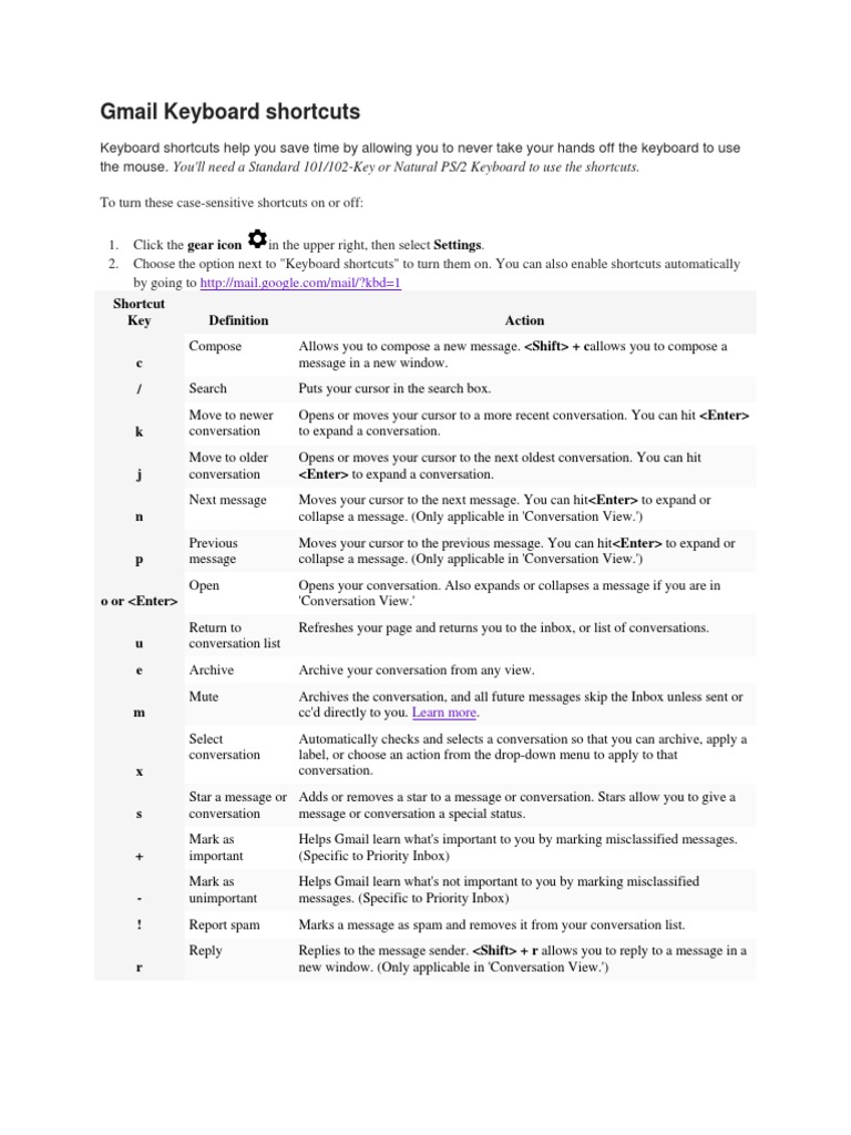 Keyboard shortcuts help you save time by allowing you to never take your hands off the keyboard to use the mouse. You'll need a Standard 101/102-Key or Natural PS/2 Keyboard to use the shortcuts. To turn these case-sensitive shortcuts on or off: 1. 2. Click the gear icon in the upper right, then select Settings. Choose the option next to "Keyboard shortcuts" to turn them on. You can also enable shortcuts automatically by going to http://mail.google.com/mail/?kbd=1 Definition Compose c / k j n p o or <Enter> u e m Select conversation x s + ! r Return to conversation list Archive Mute Previous message Open Search Move to newer conversation Move to older conversation Next message Action Allows you to compose a new message. <Shift> + callows you to compose a message in a new window. Puts your cursor in the search box. Opens or moves your cursor to a more recent conversation. You can hit <Enter> to expand a conversation. Opens or moves your cursor to the next oldest conversation. You can hit <Enter> to expand a conversation. Moves your cursor to the next message. You can hit<Enter> to expand or collapse a message. (Only applicable in 'Conversation View.') Moves your cursor to the previous message. You can hit<Enter> to expand or collapse a message. (Only applicable in 'Conversation View.') Opens your conversation. Also expands or collapses a message if you are in 'Conversation View.' Refreshes your page and returns you to the inbox, or list of conversations. Archive your conversation from any view. Archives the conversation, and all future messages skip the Inbox unless sent or cc'd directly to you. Learn more. Automatically checks and selects a conversation so that you can archive, apply a label, or choose an action from the drop-down menu to apply to that conversation.