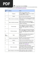 Archive and next Removes the current view's label from your conversation and moves to the next one. Undo Update current conversation Move cursor to chat search Remove from Current View* Undoes your previous action, if possible (works for actions with an 'undo' link). Updates your current conversation when there are new messages. Moves your cursor directly to the chat search box. Automatically removes the message or conversation from your current view. From 'Inbox,' 'y' means Archive From 'Starred,' 'y' means Unstar From 'Trash,' 'y' means Move to inbox From any label, 'y' means Remove the label * 'y' has no effect if you're in 'Spam,' 'Sent,' or 'All Mail.' Displays the 'More Actions' drop-down menu. Show keyboard < Ctrl> + <Down arrow> moves from edit field in your chat window to select the 'Video and more' menu Next, press <Tab> to select the emoticon menu Press <Enter> to open the selected menu