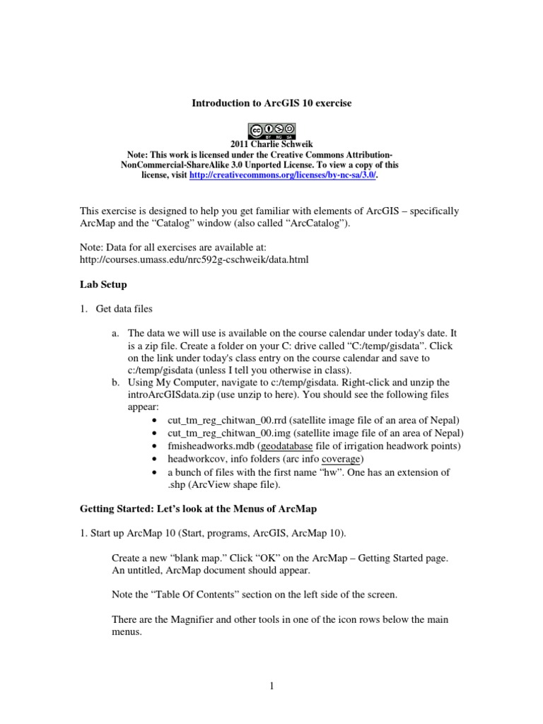 This exercise is designed to help you get familiar with elements of ArcGIS specifically ArcMap and the Catalog window (also called ArcCatalog). Note: Data for all exercises are available at: http://courses.umass.edu/nrc592g-cschweik/data.html Lab Setup 1. Get data files a. The data we will use is available on the course calendar under today's date. It is a zip file. Create a folder on your C: drive called C:/temp/gisdata. Click on the link under today's class entry on the course calendar and save to c:/temp/gisdata (unless I tell you otherwise in class). b. Using My Computer, navigate to c:/temp/gisdata. Right-click and unzip the introArcGISdata.zip (use unzip to here). You should see the following files appear: cut_tm_reg_chitwan_00.rrd (satellite image file of an area of Nepal) cut_tm_reg_chitwan_00.img (satellite image file of an area of Nepal) fmisheadworks.mdb (geodatabase file of irrigation headwork points) headworkcov, info folders (arc info coverage) a bunch of files with the first name hw. One has an extension of .shp (ArcView shape file). Getting Started: Lets look at the Menus of ArcMap 1. Start up ArcMap 10 (Start, programs, ArcGIS, ArcMap 10). Create a new blank map. Click OK on the ArcMap Getting Started page. An untitled, ArcMap document should appear. Note the Table Of Contents section on the left side of the screen. There are the Magnifier and other tools in one of the icon rows below the main menus.