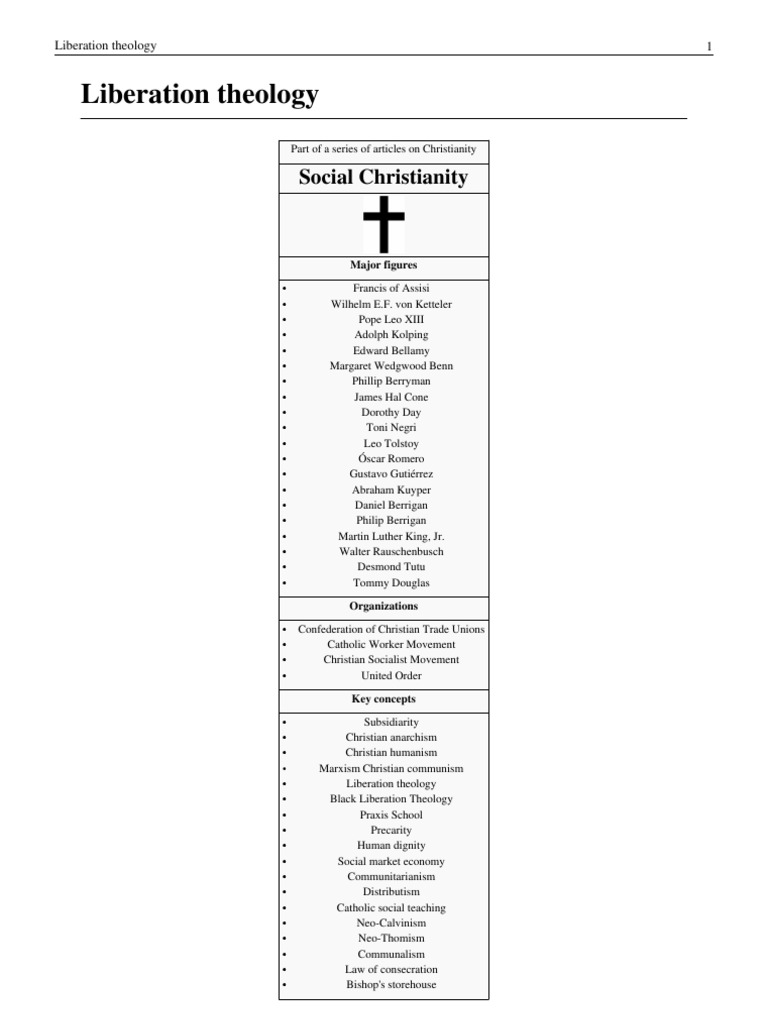 Liberation theology Source: http://en.wikipedia.org/w/index.php?oldid=546834981 Contributors: -- April, 2620:0:E50:100F:D67:403F:B177:D875, A-giau, AEDC, Aardwolf, Ace of Raves, Aitias, Alangdon86, Alexb102072, Alfredo elejalde, Algarrobo, AlimanRuna, Alvaron, Andkore, Andycjp, Anibal06, Annoynmous, Anyep, Apeloverage, Apollo5600, Aram33, Athene cunicularia, Athiraa, AugustinMa, Ave Caesar, BD2412, BEnTwiG, BMF81, Beatlemaniacjng, Beckydornon, Beland, Bellhalla, Benabik, Berkeley Common, Besednjak, Billsbest, Bjorn Martiz, Blainster, BokicaK, Bookworm857158367, Briaboru, Bruxism, Burntsauce, C-squared, CSWarren, CambridgeBayWeather, Camw, Can't sleep, clown will eat me, Carl.badgley, Carolynparrishfan, Cast, Cgingold, Che Wolfowitz, Chill doubt, Chiton magnificus, Christum, Chubbles, Chun-hian, Cjrs 79, ClamDip, ClaudeMuncey, ClaudineChionh, Closedmouth, Cmdrjameson, Colonies Chris, CommonsDelinker, Comraderedoctober, Conical Johnson, Conman3000, Conor Kenny, Crculver, Cs-wolves, Cspalletta, Cuchullain, Cwspain, CyberAnth, DJ Clayworth, DO'Neil, DaleRich, Daniel C, Dar-Ape, Dave souza, Davymast, Dbiel, Delirium, Diannaa, Dltcentennial, Dodger67, Dogru144, DonPaolo, Dr. B. R. Lang, Drmies, Dukeofomnium, ENeville, Eb7473, Ebyabe, El C, Elijahmeeks, Elizium23, Emorier, Empyrius, Ephilei, Erauch, Error, Fclingerman, Firefly322, Flatterworld, Flex, Foxxygirltamara, Franz weber, Fraytel, Geremia, Gordon schumway, Gothnic, Grenavitar, Groggy Dice, Gugganij, Guppy, Gwernol, Gypsydoctor, Hairy Dude, Hank Miles, Harris7, Hasam, Hayesstw, Heff01, Helix84, HuPi, Hyacinth, Incarnadine166, Infocidal, Ingolfson, J Di, J.delanoy, JASpencer, Jaime abc, Jakes18, James A. Donald, Jared Preston, Jawns317, JayJasper, Jayen466, JerroldPease-Atlanta, Jevergreen, Jezzaf, Jgrayski, JonHarder, Jonas Mur, Jonycl, JorgePeixoto, Joseph Solis in Australia, Jossi, Jpoelma13, Juancarlos2004, Julippia, KHM03, Kaihsu, Kaliz, Kbdank71, Kellyprice, Ketiltrout, Korossyl, Kourkoumelis, KyraVixen, Lapsed Pacifist, Laura1822, Laureano-M-B, Lawrence Cohen, Lihaas, Llywrch, Logan, LonelyBoy2012, Loonymonkey, Loremaster, Louiskrog, Lumal, Lyonscc, Mahnut, Makeemlighter, Man vyi, Mandarax, Marek69, Mark91, Marnen, Maththeomom, Mbraverman, Mddake, Meco, MercyBreeze, MerricMaker, Metropolitan90, Michaeladenner, Michaelbusch, Michas pi, Miguel de Servet, Mikehoffman, Millsdavid, Mirrormundo, MisfitToys, Mistico, Monegasque, Mordac, Mr Rhys, Mrevan, Mrzaius, Mtstroud, Murcielago, Mvblair, Mycos, Nakon, Nareek, Nathanielfirst, Neelix, Neutrality, Nicholas Alexander, Nick Levine, Nihola, Nikodemos, Nirvana2013, Nobunaga24, Ohathaway, Ohnoitsjamie, Ojl, Opus88888, Orangemike, Pastordavid, Paul foord, Paularblaster, Peacenik, Peterlathamjones, Phil Bridger, Pigman, Queerudite, R'n'B, RPH, Radagast3, Radicalsubversiv, Rangerdude, Rd232, Readingwords, Redthoreau, Resisting arrest with violence, Rholton, Rich Farmbrough, Rivers99, Rjwilmsi, Robert1947, Robitude, Robko626, RookZERO, Rory096, Rotzo, Roydosan, RufusRoughcut, Rursus, RyanChamberlyn, Sabre ball, Saforrest, Saint-Louis, Sasha Kopf, SatyrTN, Saxophilist, Sebastianvattamattam, Segregold, Sesel, Sfarney, ShelleyAdams, Shiki2, Sighter Goliant, Sjanenelson, Sjury, Skysmith, Smith2006, Smmurphy, Snowded, SonofRage, Spiffy sperry, StAnselm, Stijn Calle, StillAlive189, Stuatcal, Suitov, Svick, Tapir Terrific, Tassedethe, Tastyweather, Tazmaniacs, Technopilgrim, Temporaluser, The wub, Themfromspace, Themightyquill, TheslB, Thirdgen, Tjic, Tjpbowman, Trbdavies, Trilobite, TupajAmaru, Turnfromgrey, Twmerrigan, Tzartzam, Unyounyo, Utcursch, VanSisean, Veledan, Viajero, Viator slovenicus, VictorVVV, Volare12, VonKitchener, W.M. O'Quinlan, Wavelength, Welsh, Wesley, West6557, Wikipietime, Wildhartlivie, William Horan, Wjmc877, Woohookitty, Wwallacee, Xcuref1endx, Xphilosopherking, , 536 anonymous edits