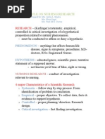 RESEARCH (Kerlinger) systematic, empirical, controlled & critical investigation of a hypothetical proposition related to natural phenomenon. PHENOMENON anything that affects human life - disease, signs & symptoms, procedures, MD, RNs HYPOTHESIS educated guess, scientific guess, tentative statement of a supposed answer. - not known yet if true of false, right or wrong RESEARCH - must be conducted to affirm or deny a hypothesis. 4 major Characteristics of a Scientific Research 5. Systematic follow step by step process. Fr identification of problem to conclusion. 6. Empirical proper objective. To collect data, facts & evidence to support hypothesis. 7. Controlled proper planning/ direction. Research design. 8. Critical investigation fact finding investigation. (synonym) PURPOSE OF ASIENTIFIC NURSING RESEARCH D descriptive purpose. Gain richer familiarity regarding a phenomena. Observation. 100% known to RN.