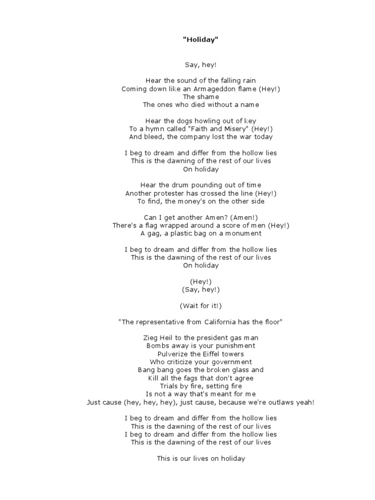 Say, hey! Hear the sound of the falling rain Coming down like an Armageddon flame (Hey!) The shame The ones who died without a name Hear the dogs howling out of key To a hymn called "Faith and Misery" (Hey!) And bleed, the company lost the war today I beg to dream and differ from the hollow lies This is the dawning of the rest of our lives On holiday Hear the drum pounding out of time Another protester has crossed the line (Hey!) To find, the money's on the other side Can I get another Amen? (Amen!) There's a flag wrapped around a score of men (Hey!) A gag, a plastic bag on a monument I beg to dream and differ from the hollow lies This is the dawning of the rest of our lives On holiday (Hey!) (Say, hey!) (Wait for it!) "The representative from California has the floor" Zieg Heil to the president gas man Bombs away is your punishment Pulverize the Eiffel towers Who criticize your government Bang bang goes the broken glass and Kill all the fags that don't agree Trials by fire, setting fire Is not a way that's meant for me Just cause (hey, hey, hey), just cause, because we're outlaws yeah! I beg to dream and differ from the hollow lies This is the dawning of the rest of our lives I beg to dream and differ from the hollow lies This is the dawning of the rest of our lives This is our lives on holiday