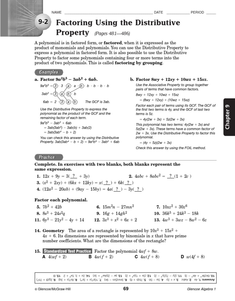 Answers: 1. 4x 2. 4abc 3. x 2y 4. 3 a 5b 5. 7b( b 6) 6. 3mn(5m 9n) 7. 10z 2( x 3z 4) 8. 8s2( s 3q) 9. 2g (8 7h2 ) 10. 6 k (6k 4 4 k 2 3) 11. (2y 7)(3y2 2) 12. (3x 1)(x2 2) 13. (w 2)(4w 2 3z ) 14. 2x 3, 5x2 2 15. B