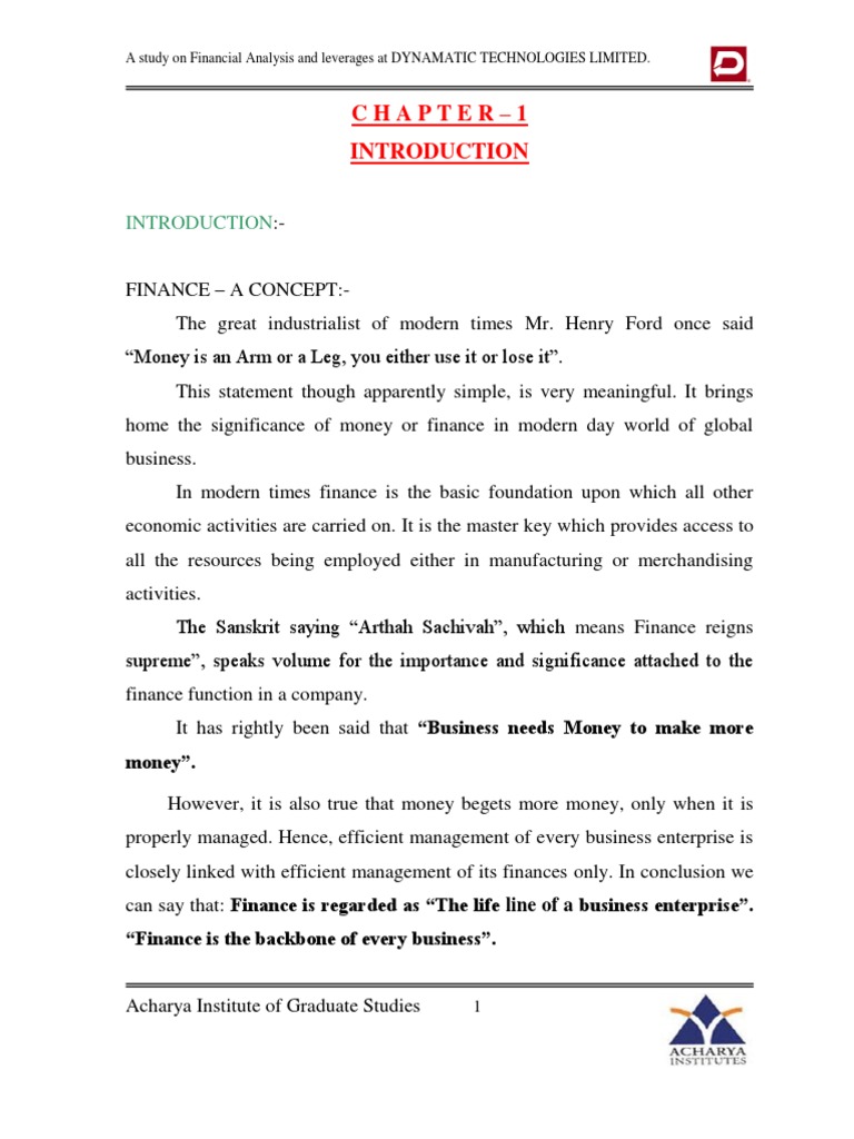 INTRODUCTION:FINANCE A CONCEPT:The great industrialist of modern times Mr. Henry Ford once said Money is an Arm or a Leg, you either use it or lose it. This statement though apparently simple, is very meaningful. It brings home the significance of money or finance in modern day world of global business. In modern times finance is the basic foundation upon which all other economic activities are carried on. It is the master key which provides access to all the resources being employed either in manufacturing or merchandising activities. The Sanskrit saying Arthah Sachivah, which means Finance reigns supreme, speaks volume for the importance and significance attached to the finance function in a company. It has rightly been said that Business needs Money to make more money. However, it is also true that money begets more money, only when it is properly managed. Hence, efficient management of every business enterprise is closely linked with efficient management of its finances only. In conclusion we can say that: Finance is regarded as The life line of a business enterprise. Finance is the backbone of every business. Acharya Institute of Graduate Studies