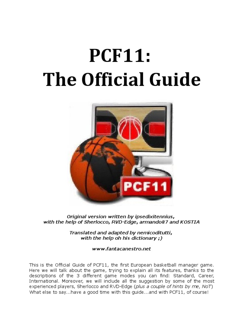 Original version written by ipsedixitennius, with the help of Sherlocco, RVD-Edge, armando87 and KOSTIA Translated and adapted by nemicoditutti, with the help oh his dictionary ;) www.fantacanestro.net This is the Official Guide of PCF11, the first European basketball manager game. Here we will talk about the game, trying to explain all its features, thanks to the descriptions of the 3 different game modes you can find: Standard, Career, International. Moreover, we will include all the suggestion by some of the most experienced players, Sherlocco and RVD-Edge (plus a couple of hints by me, NoT) What else to say...have a good time with this guide...and with PCF11, of course!