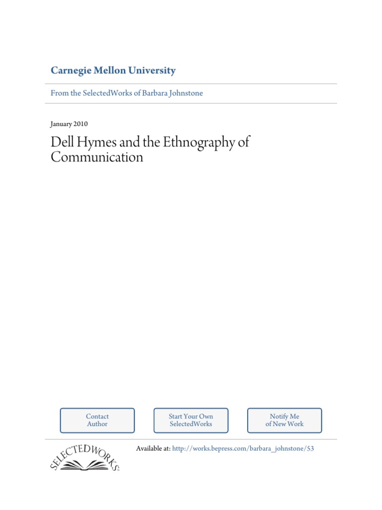 Dell Hymes and the Ethnography of Communication Barbara Johnstone and William M. Marcellino Rhetoric Program, Department of English Carnegie Mellon University Pittsburgh PA 152123 USA Corresponding author: bj4@andrew.cmu.edu Dell Hymes formative role in the ethnography of communication, ethnopoetics and educational ethnography alone merit him biographic attention. In addition, though, tracing out Dell Hymes career arc offers a window on the birth and development of sociolinguistics as a whole. The particular cluster of early influences on Hymes Franz Boaz, Edward Sapir, Roman Jakobson and Kenneth Burke as well as Hymes resulting resistance to Chomskyan linguistics, are representative of the sources of impetus for sociolinguistics in general. Hymes had an abiding personal and scholarly interest in American Indians in all their linguistic and cultural diversity. He argued for a widened scope for linguistics which started with diversity rather than in a search for the universal. In particular, he wanted linguists to pay attention to the poetic, aesthetic, reflexive aspects of discourse through which cultural knowledge is circulated. His interest in diversity has always been linked with a concern for the sources and consequences of inequality, and much of his work has taken place in the context of educational research. In Hymes interests, we can see sociolinguistics recurring concerns. If we want to understand how sociolinguistics grew out of linguistics, understanding Dell Hymes life and career is a good place to start. Life and Intellectual Biography Hymes was born in Portland, Oregon in 1927. He grew up there, attending Reed College as an undergraduate, and began graduate work in anthropology at Indiana University in 1950, eventually receiving a doctorate instead in linguisticsm in 1955, with minors in anthropology and folklore. This constellation of interests would stay with Hymes throughout his career. C. F. Voegelin, Hymes dissertation advisor at Indiana, described Hymes as a literary critic and minor poet who surprised us at Indiana when shifting from very general cultural interests to linguistics (Murray, 1998: 100). For Hymes, though, these interests were naturally allied, allowing him to explore the use of language, oral narrative and poetry, the history of anthropology and linguistics, Native Americans, theology (Hymes, n.d.). While at Indiana, Hymes began his association with Roman Jakobson, whose crucial contribution was to introduce a 'functionalist' perspective and to do so in a way that suggested an empirical, manageable way of dealing with speech functions (Hymes, 1975: 364), quoted in (Murray, 1998: 100) . That functionalist concern with how humans actually use language would steer Hymes work and presages sociolinguistics concern for contextualized language use.