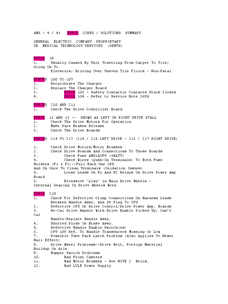 GENERAL ELECTRIC COMPANY PROPRIETARY GE MEDICAL TECHNOLOGY SERVICES (GEMTS) ERROR 19 1. Usually Caused By Unit Traveling From Carpet To Tile; Going On To Elevators; Driving Over Uneven Tile Floors - Non-Fatal ERRORS 100 TO 107 1. Recalibrate 2. Replace The 3. ERROR 4. ERROR The Charger Charger Board 103 - Safety Contactor Contacts Stuck Closed 104 - Refer to Service Note 3684