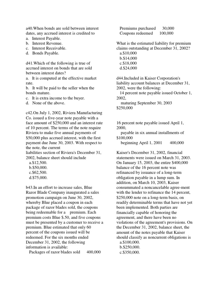 c. Interest Receivable. d. Bonds Payable. d41.Which of the following is true of accrued interest on bonds that are sold between interest dates? a. It is computed at the effective market rate. b. It will be paid to the seller when the bonds mature. c. It is extra income to the buyer. d. None of the above. c42.On July 1, 2002, Riviera Manufacturing Co. issued a five-year note payable with a face amount of $250,000 and an interest rate of 10 percent. The terms of the note require Riviera to make five annual payments of $50,000 plus accrued interest, with the first payment due June 30, 2003. With respect to the note, the current liabilities section of Riviera's December 31, 2002, balance sheet should include a.$12,500. b.$50,000. c.$62,500. d.$75,000. b43.In an effort to increase sales, Blue Razor Blade Company inaugurated a sales promotion campaign on June 30, 2002, whereby Blue placed a coupon in each package of razor blades sold, the coupons being redeemable for a premium. Each premium costs Blue $.50, and five coupons must be presented by a customer to receive a premium. Blue estimated that only 60 percent of the coupons issued will be redeemed. For the six months ended December 31, 2002, the following information is available: Packages of razor blades sold 400,000