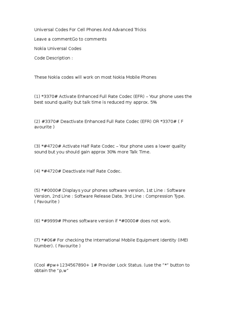Universal Codes For Cell Phones And Advanced Tricks Leave a commentGo to comments Nokia Universal Codes Code