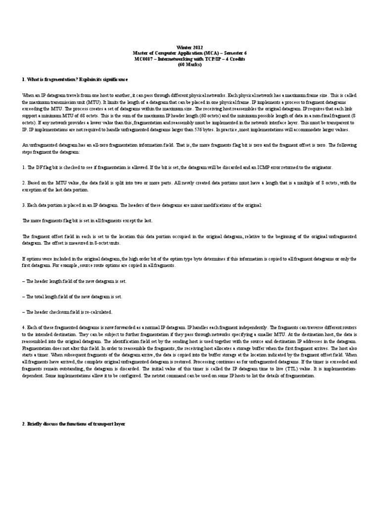 1. What is fragmentation? Explain its significance When an IP datagram travels from one host to another, it can pass through different physical networks. Each physical network has a maximum frame size. This is called the maximum transmission unit (MTU). It limits the length of a datagram that can be placed in one physical frame. IP implements a process to fragment datagrams exceeding the MTU. The process creates a set of datagrams within the maximum size. The receiving host reassembles the original datagram. IP requires that each link support a minimum MTU of 68 octets. This is the sum of the maximum IP header length (60 octets) and the minimum possible length of data in a non-final fragment (8 octets). If any network provides a lower value than this, fragmentation and reassembly must be implemented in the network interface layer. This must be transparent to IP. IP implementations are not required to handle unfragmented datagrams larger than 576 bytes. In practice, most implementations will accommodate larger values. An unfragmented datagram has an all-zero fragmentation information field. That is, the more fragments flag bit is zero and the fragment offset is zero. The following steps fragment the datagram: 1. The DF flag bit is checked to see if fragmentation is allowed. If the bit is set, the datagram will be discarded and an ICMP error returned to the originator. 2. Based on the MTU value, the data field is split into two or more parts. All newly created data portions must have a length that is a multiple of 8 octets, with the exception of the last data portion. 3. Each data portion is placed in an IP datagram. The headers of these datagrams are minor modifications of the original: The more fragments flag bit is set in all fragments except the last. The fragment offset field in each is set to the location this data portion occupied in the original datagram, relative to the beginning of the original unfragmented datagram. The offset is measured in 8-octet units. If options were included in the original datagram, the high order bit of the option type byte determines if this information is copied to all fragment datagrams or only the first datagram. For example, source route options are copied in all fragments. The header length field of the new datagram is set. The total length field of the new datagram is set. The header checksum field is re-calculated. 4. Each of these fragmented datagrams is now forwarded as a normal IP datagram. IP handles each fragment independently. The fragments can traverse different routers to the intended destination. They can be subject to further fragmentation if they pass through networks specifying a smaller MTU. At the destination host, the data is reassembled into the original datagram. The identification field set by the sending host is used together with the source and destination IP addresses in the datagram. Fragmentation does not alter this field. In order to reassemble the fragments, the receiving host allocates a storage buffer when the first fragment arrives. The host also starts a timer. When subsequent fragments of the datagram arrive, the data is copied into the buffer storage at the location indicated by the fragment offset field. When all fragments have arrived, the complete original unfragmented datagram is restored. Processing continues as for unfragmented datagrams. If the timer is exceeded and fragments remain outstanding, the datagram is discarded. The initial value of this timer is called the IP datagram time to live (TTL) value. It is implementationdependent. Some implementations allow it to be configured. The netstat command can be used on some IP hosts to list the details of fragmentation.