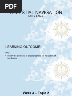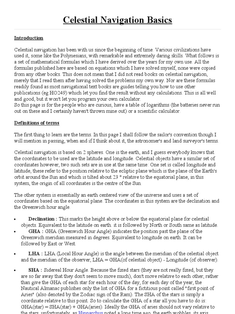Introduction Celestial navigation has been with us since the beginning of time. Various civilizations have used it, some like the Polynesians, with remarkable and extremely daring skills. What follows is a set of mathematical formulas which I have derived over the years for my own use. All the formulas published here are based on equations which I have solved myself, none were copied from any other books. This does not mean that I did not read books on celestial navigation, merely that I read them after having solved the problems my own way. Nor are these formulas readily found as most navigational text books are guides telling you how to use other publications (eg HO249) which let you find the result without any calculations. This is all well and good, but it won't let you program your own calculator. So this page is for the people who are curious, have a table of logarithms (the batteries never run out on these and I certainly haven't thrown mine out) or a scientific calculator. Definitions of terms The first thing to learn are the terms. In this page I shall follow the sailor's convention though I will mention in passing, when and if I think about it, the astronomer's and land surveyor's terms. Celestial navigation is based on 2 spheres. One is the earth, and I guess everybody knows that the coordinates to be used are the latitude and longitude. Celestial objects have a similar set of coordinates however, two such sets are in use at the same time: One set is called longitude and latitude, these refer to the position relative to the ecliptic plane which is the plane of the Earth's orbit around the Sun and which is tilted about 23 relative to the equatorial plane, in this system, the origin of all coordinates is the centre of the Sun. The other system is essentially an earth centered view of the universe and uses a set of coordinates based on the equatorial plane. The coordinates in this system are the declination and the Greenwich hour angle.