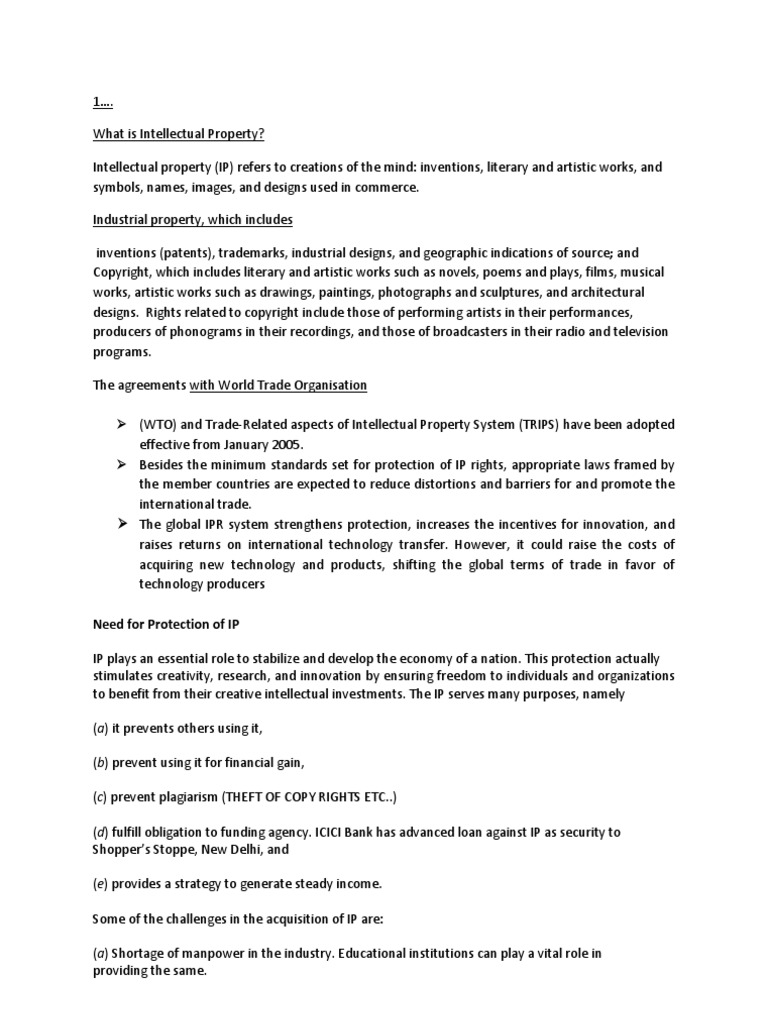 Intellectual property (IP) refers to creations of the mind: inventions, literary and artistic works, and symbols, names, images, and designs used in commerce. Industrial property, which includes inventions (patents), trademarks, industrial designs, and geographic indications of source; and Copyright, which includes literary and artistic works such as novels, poems and plays, films, musical works, artistic works such as drawings, paintings, photographs and sculptures, and architectural designs. Rights related to copyright include those of performing artists in their performances, producers of phonograms in their recordings, and those of broadcasters in their radio and television programs. The agreements with World Trade Organisation (WTO) and Trade-Related aspects of Intellectual Property System (TRIPS) have been adopted effective from January 2005. Besides the minimum standards set for protection of IP rights, appropriate laws framed by the member countries are expected to reduce distortions and barriers for and promote the international trade. The global IPR system strengthens protection, increases the incentives for innovation, and raises returns on international technology transfer. However, it could raise the costs of acquiring new technology and products, shifting the global terms of trade in favor of technology producers Need for Protection of IP IP plays an essential role to stabilize and develop the economy of a nation. This protection actually stimulates creativity, research, and innovation by ensuring freedom to individuals and organizations to benefit from their creative intellectual investments. The IP serves many purposes, namely (a) it prevents others using it, (b) prevent using it for financial gain, (c) prevent plagiarism (THEFT OF COPY RIGHTS ETC..) (d) fulfill obligation to funding agency. ICICI Bank has advanced loan against IP as security to Shoppers Stoppe, New Delhi, and (e) provides a strategy to generate steady income. Some of the challenges in the acquisition of IP are: (a) Shortage of manpower in the industry. Educational institutions can play a vital role in providing the same.
