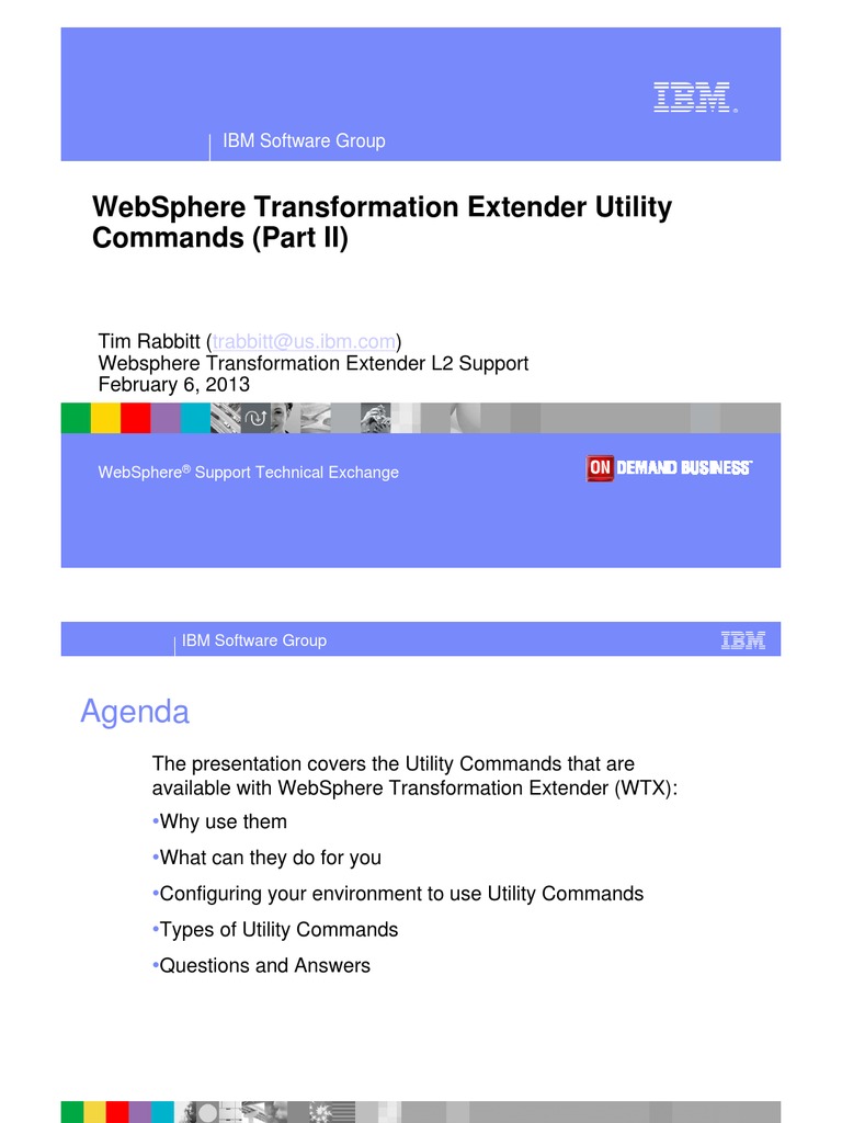 The presentation covers the Utility Commands that are available with WebSphere Transformation Extender (WTX):