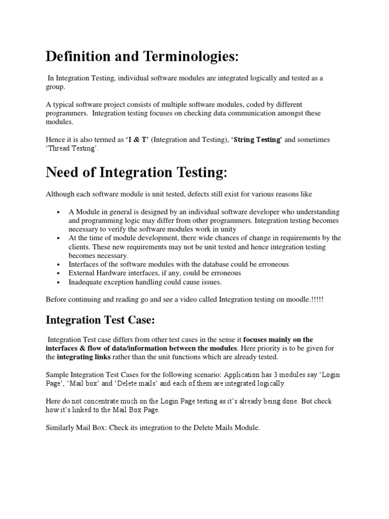 A Module in general is designed by an individual software developer who understanding and programming logic may differ from other programmers. Integration testing becomes necessary to verify the software modules work in unity At the time of module development, there wide chances of change in requirements by the clients. These new requirements may not be unit tested and hence integration testing becomes necessary. Interfaces of the software modules with the database could be erroneous External Hardware interfaces, if any, could be erroneous Inadequate exception handling could cause issues.