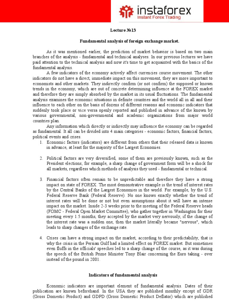 Lecture 13 Fundamental analysis of foreign exchange market. As it was mentioned earlier, the prediction of market behavior is based on two main branches of the analysis - fundamental and technical analyses. In our previous lectures we have paid attention to the technical analysis and now it's time to get acquainted with the basics of the fundamental analysis. A few indicators of the economy actively affect currencies course movement. The other indicators do not have a direct, immediate impact on this movement, they are more important to economists and other markets. They indirectly confirm (or not confirm) the supposed or known trends in the economy, which are out of concrete determining influence at the FOREX market and therefore they are simply absorbed by the market in its usual fluctuations. The fundamental analysis examines the economic situations in definite countries and the world all in all and their influence to each other on the basis of dozens of different reasons and economic indicators that suddenly took place or vice versa openly reported and published in advance of the known by various governmental, non-governmental and academic organizations from major world countries plan. Any information which directly or indirectly may influence the economy can be regarded as fundamental. It all can be divided into 4 main categories - economic factors, financial factors, political events and crises. 1. Economic factors (indicators) are different from others that their released data is known in advance, at least for the majority of the Largest Economies. 2. Political factors are very diversified, some of them are previously known, such as the President elections; for example, a sharp change of government form will be a shock for all markets, regardless which methods of analysis they used - fundamental or technical. 3. Financial factors often remain to be unpredictable and therefore they have a strong impact on state of FOREX. The most demonstrative example is the trend of interest rates by the Central Banks of the Largest Economies in the world. For example, by the U.S. Federal Reserve Bank (Federal Reserve). No one knows exactly whether the trend of interest rates will be done or not but even assumptions about it will have an intense impact on the market. Inside 2-3 weeks prior to the meeting of the Federal Reserve heads (FOMC - Federal Open Market Committee), who gather together in Washington for their meeting every 1.5 months, they accepted by the market very nervously, if the change of the interest rate was a sudden one, then the market literally became "nervous", which leads to sharp changes of the exchange rate. 4. Crises can have a strong impact on the market, according to their predictability, that is why the crisis in the Persian Gulf had a limited effect on FOREX market. But sometimes even fluffs in the officials' speeches led to a sharp change of the course, as it was during the speech of the British Prime Minister Tony Blair concerning the Euro taking - over instead of the pound in 2001. Indicators of fundamental analysis Economic indicators are important element of fundamental analysis. Dates of their publication are known beforehand. In the USA they are published monthly except of GDR (Gross Domestic Product) and GDPD (Gross Domestic Product Deflator) which are published