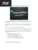 Special uses: a. Always + Continuous forms This stresses the repetitiveness of the action and often indicates that the speaker finds the repeated action surprising, strange or irritating. We use constantly, forever, continually. She was always criticising me The new technology is constantly changing b. Past Continuous for polite request I was wondering if you could recommend a good book. I was hopping you might help me with this application form. c. Present Continuous for future arrangements There is usually a time phrase in the sentence or it is clear from the context that we are talking about future. What are you doing over Christmas? d. With modal verbs The continuous infinitive can give a different meaning from the simple infinitive. They might be staying at the Sheraton Hotel (present possibility) They might stay at the Sheraton Hotel (future possibility). They must be having a party (logical deduction or necessity). They must have a party soon (personal obligation).