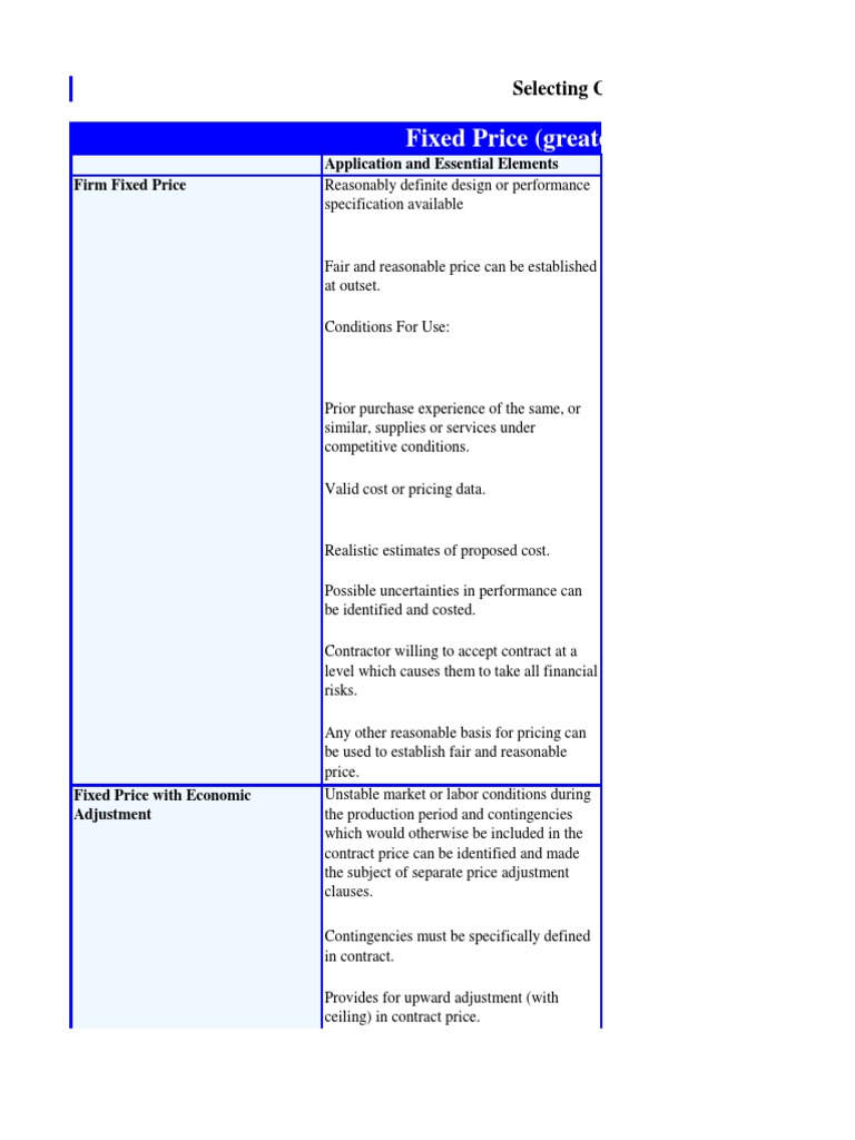 Suitability Commercial products and commercial type products, military items for which reasonable prices can be established, and services. Limitations Price not subject to adjustment regardless of contractor performance costs. Places 100% of financial risk on contractor. Places least amount of administrative burden on contracting officer.