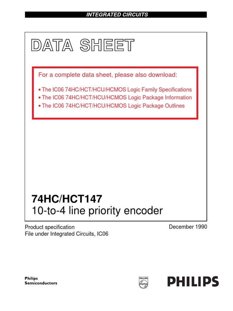 The 74HC/HCT147 are high-speed Si-gate CMOS devices and are pin compatible with low power Schottky TTL (LSTTL). They are specified in compliance with JEDEC standard no. 7A. The 74HC/HCT147 9-input priority encoders accept data from nine active LOW inputs (A0 to A8) and provide a binary representation on the four active LOW outputs (Y0 to Y3). A priority is assigned to each input so that when two or more inputs are simultaneously active, the input with the highest priority is represented on the output, with input line A8 having the highest priority. The devices provide the 10-line to 4-line priority encoding function by use of the implied decimal zero. The zero is encoded when all nine data inputs are HIGH, forcing all four outputs HIGH.