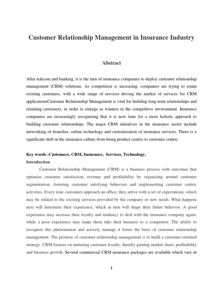 Key words :Customers, CRM, Insurance, Services, Technology, Introduction Customer Relationship Management (CRM) is a business process with outcomes that optimize customer satisfaction, revenue and profitability by organizing around customer segmentation, fostering customer satisfying behaviors and implementing customer centric activities. Every time customers approach an office, they arrive with a set of expectations, which may be related to the existing services provided by the company or new needs. What happens next will determine their experience, which in turn will shape their future behavior. A good experience may increase their loyalty and tendency to deal with the insurance company again; while a poor experience may make them take their business to a competitor. The ability to recognize this phenomenon and actively manage it forms the basis of customer relationship management. The promise of customer relationship management is to build a customer-oriented strategy. CRM focuses on nurturing customer loyalty, thereby gaining market share, profitability and business growth. Several commercial CRM insurance packages are available which vary in