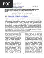 time, space, and information access in world trade and commerce as a whole. The e-banking and ecommerce is changing the banking industry and is having the major effects on banking relationships. Within banking culture, the flow of information in customer services and applications cannot be understood if detached from an Information Communication Technology technical prospective. The widening use of Information Communication Technology in e-banking is having profound impacts on e-services. The impacts of Information Communication Technology are more than just those of efficiency and effectiveness. The impact of Information Communication Technology is moving deeper and deeper into substantial economic and social science domains, where it increasingly interacts with them. The literature provides an extensive account of the relationships between Information and Communication Technology, e-service quality, customer satisfaction, and financial performance. In this paper authors have briefly described the various researches carried out in the area of e-banking. This paper also states that how the adoption of technology is useful for banking organizations to identify, preserve and disseminate best context of e-service practices to satisfy the customers to achieve business goal. Reference Books: 1. Report of the Committee on Customer Service in Banks, Reserve Bank of India, Mumbai-2011. 2. SBI Training guide for Internet Banking-2010 3. E-Banking in India, Jaysree, ICFAI-2009 4. E.Banking in India: Challenges and Opportunities, Rimpi, New Century Publications=0ct.2007.