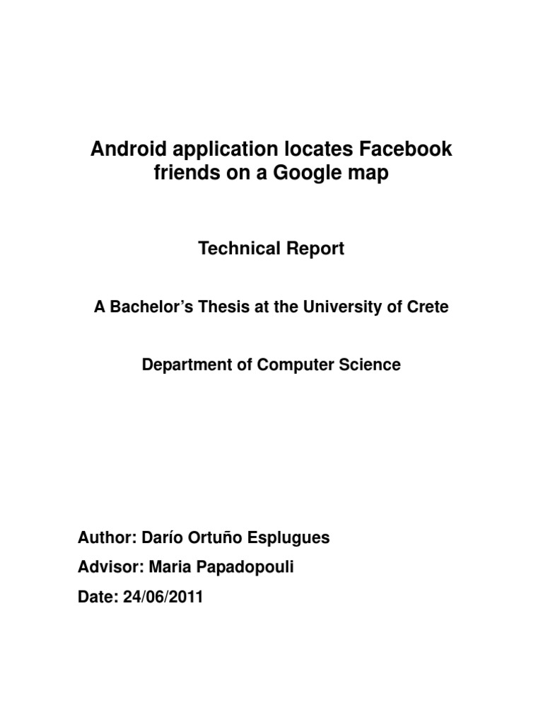 Google Inc. Android Developer Guide. Available in Web: <http://developer.android.com/guide/index.html> Google Inc. Android Reference. Available in Web: <http://developer.android.com/reference/packages.html> Google Inc. Android SDK. Available in Web: <http://developer.android.com/sdk/index.html> Facebook. Facebook Developers Documentation. Available in Web: <http://developers.facebook.com/docs/> Facebook. Facebook SDK. Available in Web: <https://github.com/facebook/facebookandroid-sdk> Google Inc. Google Maps Reference for Android. Available in Web: <http://code.google.com/intl/es-ES/android/add-ons/google-apis/reference/index.html> Google Inc. Google Maps Dev Guide for Android. Available in Web: <http://code.google.com/android/add-ons/google-apis/maps-overview.html> Steiniger, Stefan, Neun, Moritz, and Edwardes, Alistair. "Foundations of Location Based Services", University of Zurich. Available in Web: <http://mesh.dl.sourceforge.net/project/jumppilot/w_other_freegis_documents/articles/lbs_lecturenotes_steinigeretal2006.pdf> Schiller, J. H., and Voisard, A., 2004. Location-based services. Morgan Kaufmann Publishers.