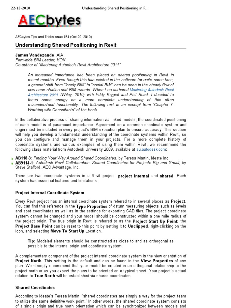 James Vandezande , AIA Firm-wide BIM Leader, HOK Co-author of Mastering Autodesk Revit Architecture 2011 An increased importance has been placed on shared positioning in Revit in recent months. Even though this has existed in the software for quite some time, a general shift from lonely BIM to social BIM can be seen in the steady flow of new case studies and BIM awards. When I co-authored Mastering Autodesk Revit Architecture 2011 (Wiley, 2010) with Eddy Krygiel and Phil Read, I decided to focus some energy on a more complete understanding of this often misunderstood functionality. The following text is an excerpt from Chapter 7: Work ing with Consultants of the book . In the collaborative process of sharing information via linked models, the coordinated positioning of each model is of paramount importance. Agreement on a common coordinate system and origin must be included in every projects BIM execution plan to ensure accuracy. This section will help you develop a fundamental understanding of the coordinate systems within Revit, so you can configure and manage them in your projects. For a more complete history of coordinate systems and various examples of using them within Revit, we recommend the following class material from Autodesk University 2009, available at au.autodesk.com : AB118-3: Finding Your Way Around Shared Coordinates , by Teresa Martin, Ideate Inc. AB9114-1: Autodesk Revit Collaboration: Shared Coordinates for Projects Big and Small, by Steve Stafford, AEC Advantage, Inc. There are two coordinate systems in a Revit project: project internal and shared. Each system has essential features and limitations. Project Internal Coordinate System Every Revit project has an internal coordinate system referred to in several places as Project. You can find this reference in the Type Properties of datum measuring objects such as levels and spot coordinates as well as in the settings for exporting CAD files. The project coordinate system cannot be changed and your model should be constructed within a one mile radius of the project origin. The true origin in Revit is referred to as the Project Start Up Point; the Project Base Point can be reset to this point by setting it to Unclipped, right-clicking on the icon, and selecting Move To Start Up Location. Tip: Modeled elements should be constructed as close to and as orthogonal as possible to the internal origin and coordinate system. A complementary component of the project internal coordinate system is the view orientation of Project North. This setting is the default and can be found in the View Properties of any plan. We strongly recommend that your model be created in an orthogonal relationship to the project north or as you expect the plans to be oriented on a typical sheet. Your projects actual relation to True North will be established via shared coordinates. Shared Coordinates According to Ideates Teresa Martin, shared coordinates are simply a way for the project team to utilize the same definitive work point. In other words, the shared coordinate system consists of a single origin and true north orientation which can be synchronized between models and even AutoCAD drawings. In the diagram shown below, you will see an architectural model and