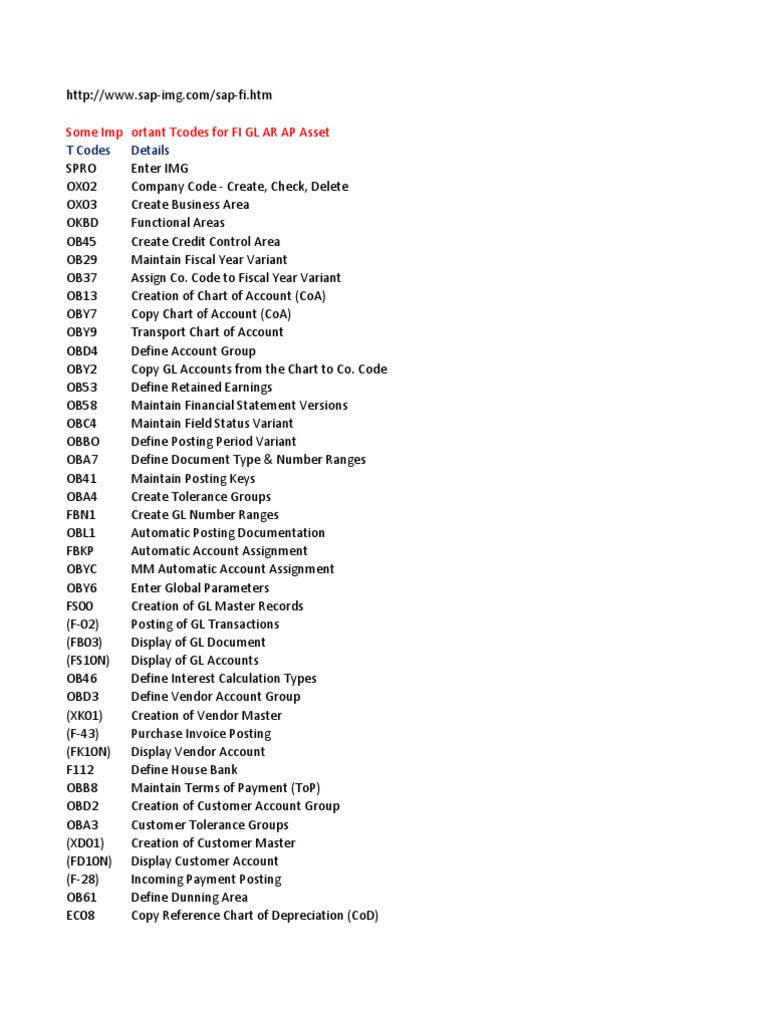 htm Some Imp T Codes SPRO OX02 OX03 OKBD OB45 OB29 OB37 OB13 OBY7 OBY9 OBD4 OBY2 OB53 OB58 OBC4 OBBO OBA7 OB41 OBA4 FBN1 OBL1 FBKP OBYC OBY6 FS00 (F-02) (FB03) (FS10N) OB46 OBD3 (XK01) (F-43) (FK10N) F112 OBB8 OBD2 OBA3 (XD01) (FD10N) (F-28) OB61 EC08 ortant Tcodes for FI GL AR AP Asset Details Enter IMG Company Code - Create, Check, Delete Create Business Area Functional Areas Create Credit Control Area Maintain Fiscal Year Variant Assign Co. Code to Fiscal Year Variant Creation of Chart of Account (CoA) Copy Chart of Account (CoA) Transport Chart of Account Define Account Group Copy GL Accounts from the Chart to Co. Code Define Retained Earnings Maintain Financial Statement Versions Maintain Field Status Variant Define Posting Period Variant Define Document Type & Number Ranges Maintain Posting Keys Create Tolerance Groups Create GL Number Ranges Automatic Posting Documentation Automatic Account Assignment MM Automatic Account Assignment Enter Global Parameters Creation of GL Master Records Posting of GL Transactions Display of GL Document Display of GL Accounts Define Interest Calculation Types Define Vendor Account Group Creation of Vendor Master Purchase Invoice Posting Display Vendor Account Define House Bank Maintain Terms of Payment (ToP) Creation of Customer Account Group Customer Tolerance Groups Creation of Customer Master Display Customer Account Incoming Payment Posting Define Dunning Area Copy Reference Chart of Depreciation (CoD)