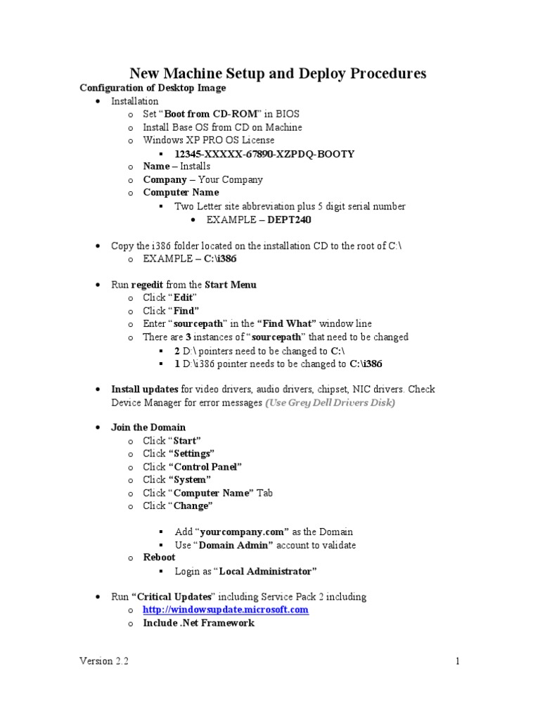 Configuration of Desktop Image Installation o Set Boot from CD-ROM in BIOS o Install Base OS from CD on Machine o Windows XP PRO OS License 12345-XXXXX-67890-XZPDQ-BOOTY o Name Installs o Company Your Company o Computer Name Two Letter site abbreviation plus 5 digit serial number EXAMPLE DEPT240 Copy the i386 folder located on the installation CD to the root of C:\ o EXAMPLE C:\i386 Run regedit from the Start Menu o Click Edit o Click Find o Enter sourcepath in the Find What window line o There are 3 instances of sourcepath that need to be changed 2 D:\ pointers need to be changed to C:\ 1 D:\i386 pointer needs to be changed to C:\i386 Install updates for video drivers, audio drivers, chipset, NIC drivers. Check Device Manager for error messages (Use Grey Dell Drivers Disk) Join the Domain o Click Start o Click Settings o Click Control Panel o Click System o Click Computer Name Tab o Click Change Add yourcompany.com as the Domain Use Domain Admin account to validate o Reboot Login as Local Administrator Run Critical Updates including Service Pack 2 including o http://windowsupdate.microsoft.com o Include .Net Framework 1