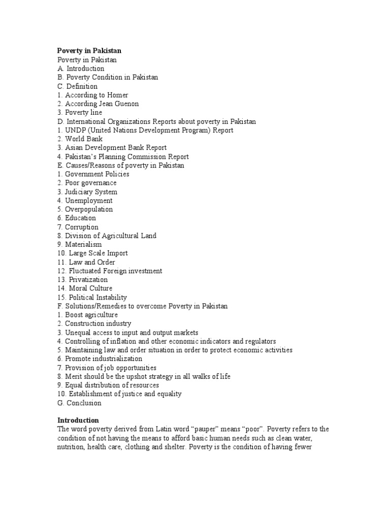 Poverty line D. International Organizations Reports about poverty in Pakistan 1. UNDP (United Nations Development Program) Report 2. World Bank 3. Asian Development Bank Report 4. Pakistans Planning Commission Report E. Causes/Reasons of poverty in Pakistan 1. Government Policies 2. Poor governance 3. Judiciary System 4. Unemployment 5. Overpopulation 6. Education 7. Corruption 8. Division of Agricultural Land 9. Materialism 10. Large Scale Import 11. Law and Order 12. Fluctuated Foreign investment 13. Privatization 14. Moral Culture 15. Political Instability F. Solutions/Remedies to overcome Poverty in Pakistan 1. Boost agriculture 2. Construction industry 3. Unequal access to input and output markets 4. Controlling of inflation and other economic indicators and regulators 5. Maintaining law and order situation in order to protect economic activities 6. Promote industrialization 7. Provision of job opportunities 8. Merit should be the upshot strategy in all walks of life 9. Equal distribution of resources 10. Establishment of justice and equality G. Conclusion Introduction The word poverty derived from Latin word pauper means poor. Poverty refers to the condition of not having the means to afford basic human needs such as clean water, nutrition, health care, clothing and shelter. Poverty is the condition of having fewer